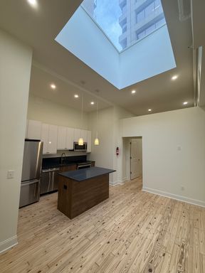 This bright unit offers hardwood floors throughout, central heat/air, modern kitchen, large closets, great separate office space, in unit washer/dryer, skylight, high ceilings, a large layout and a balcony off of the bedroom.